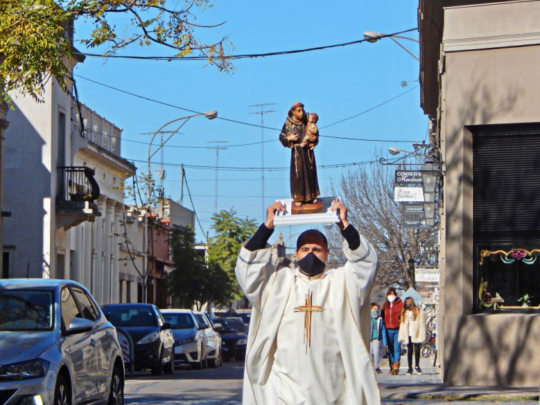 El Padre Albino Cabral, párroco de la Parroquia San Antonio de Padua, transmitió hoy la misa y la procesión en vivo por Facebook: “esta fiesta va a quedar para la historia de San Antonio de Areco y para mi historia también”, expresó el Padre en el comienzo de la homilía. esta fue su primera celebración de las fiestas patronales en Areco y también fue el primer 13 de junio en el que la Parroquia estuvo vacía. Sobre el santo patrono, el Padre reflexionó: “San Antonio no se conformó, él había formado parte de la comunidad de los agustinos; pero cuando su vida ya estaba definida, la muerte de unos mártires franciscanos despertó en él entusiasmo y decidió unirse a su congregación. Además, fue contemporáneo de San Francisco, lo conoció, éste lo quiso mucho y le dio permiso para que instruyera a su comunidad”.