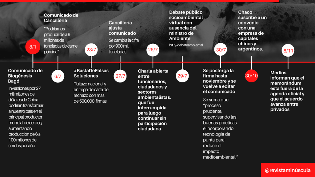 Los principales voceros en contra del acuerdo manifestaron en el libro «10 mitos y verdades de las megafactorías de cerdos«, que al igual que sucedió con la soja transgénica en los 90, con la minería a cielo abierto en los 2000 o con el fracking en la última década, el gobierno buscó avanzar sin debate ni estudios de impacto ambiental, social y sanitario, “como si no hubiera crisis sanitaria ni pandemia, y mucho menos crisis socioecológica o emergencia climática”.