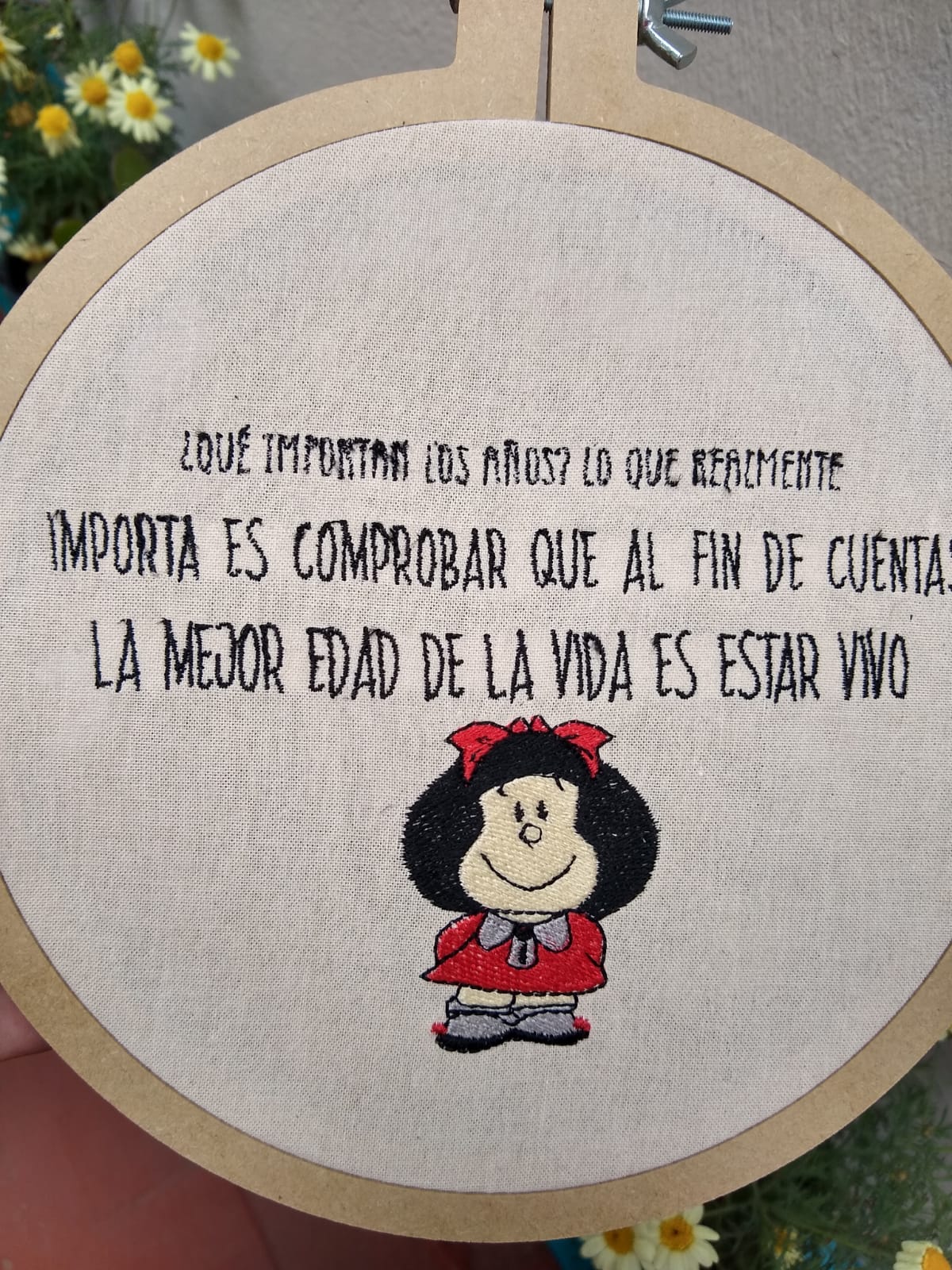 «La historia detrás de la foto es simple. Un día estábamos hablando, en una de esas conversaciones donde parece que te están gastando y decís ‘¿en serio?’. Y mi amiga me dice: ‘Me la imagino a Mafalda diciéndolo como pensativa’. Entonces buscamos en la web una cara de Mafalda que se ajustara a esa frase y surgió esta imagen de la foto. Nos pusimos primero a hacer el dibujo y buscar la letra con la que se hacían las viñetas. Un día me dice: ‘tengo un regalo para vos’, y apareció con esa remera que salió de nuestra conversación»,