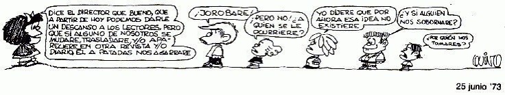 “Dice el director que bueno, que a partir de hoy podemos darle un descanso a los lectores, pero que si alguno de nosotros se mudare, trasladare, y/o apareciere en otra revista y/o diario, él a patadas nos agarrare”. “¡Jorobare”!, exclama atónito Felipe. “¡Pero no! ¿A quién se le ocurriere?”, inquiere Libertad. “Yo dijere que por ahora esa idea no existiere”, se lamenta el ocurrente de Miguelito. “¿Y si alguien nos sobornare?”, cuestiona preocupado Manolito. “¿Por quién nos tomares?”, sentencia con indignación en el gesto el minúsculo Guille.