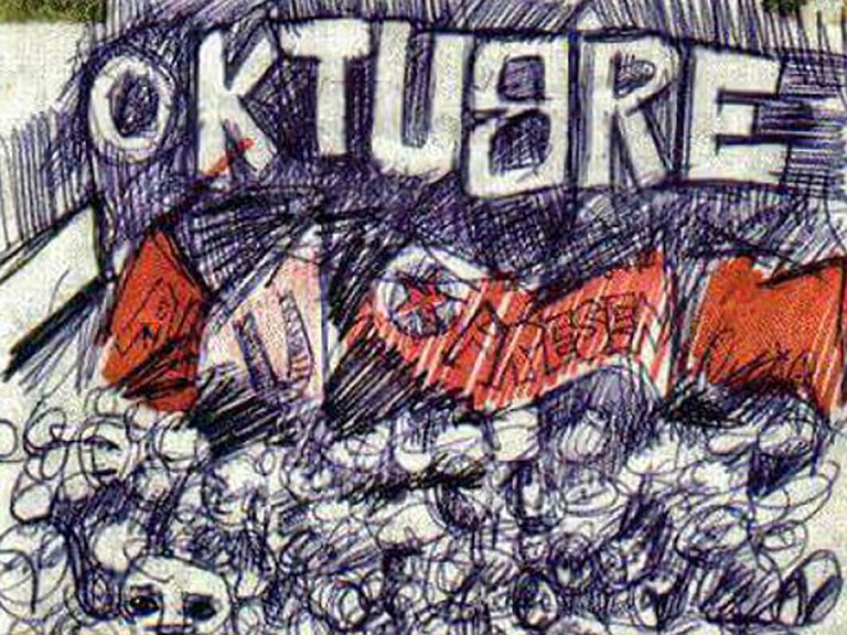 Sobre una servilleta en un bar, Rocambole hizo el primer boceto de lo que sería la tapa del disco; en tiempos donde literalmente “hacer la tapa” significaba eso, ponerle el cuerpo y las manos al arte de un disco. A través de impresiones serigráficas, se decidió que los colores no serían demasiados. Bastaron el rojo, el negro, el blanco de la cartulina y algunos pequeños detalles en gris para que el espíritu revolucionario se hiciera presente en el vinilo que llevaba como título “Oktubre” con letras rojas y reflejadas para dar la impresión de pertenecer al alfabeto cirílico.