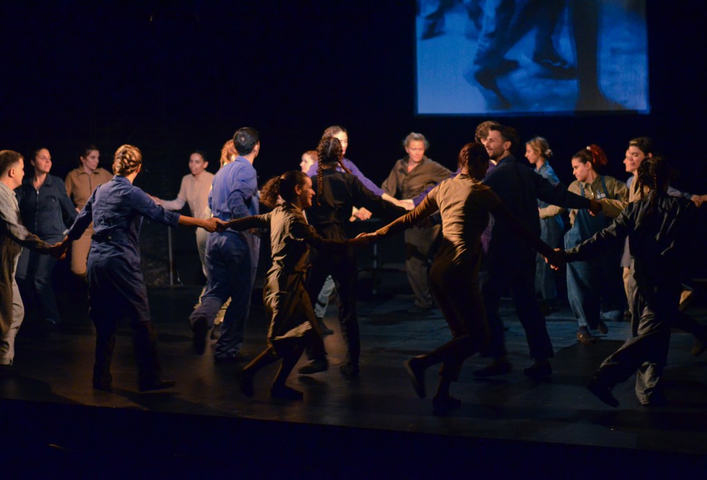 Cantan a coro y, mecánicamente alienados, dominan el escenario. Bailan, filosofan sobre el trabajo, la vida y la muerte. Cada tanto, la obra se pone en pausa y los actuantes comienzan a desnudarse del personaje.