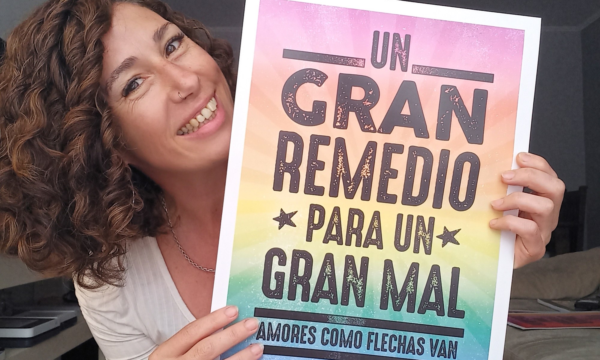 En mayo de 2022 hice mi primer póster. Quería ver una frase que amo y que cantamos con mi compañero: “Un ranchito borracho de sueños y amor quiero yo”, (El Cosechero de Ramón Ayala), en formato de afiche callejero, estilo gráfico que siempre me fascinó desde pequeña, por eso quería lograr algo que lo emule, pero con herramientas digitales (que también aprendí a usar de manera autodidacta). Hice el primero, pero seguido de 6 más. Porque había muchas cosas que sentía y que podía “decir” a través de los pósters.