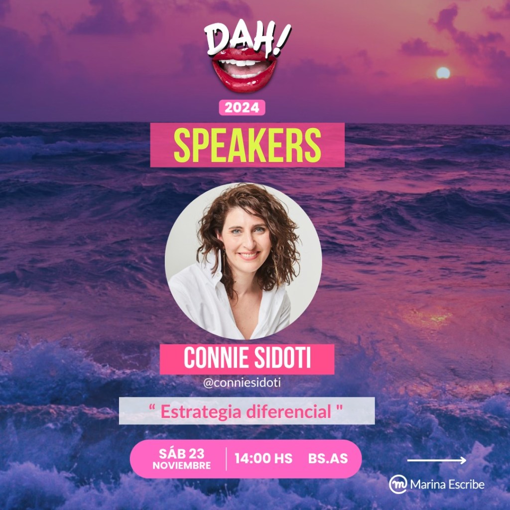 Además va a estar Connie Sidoti, que fue la mejor speaker de la edición 2023, y va a hablar del Marketing de Diferenciación. Lo que me gusta de ella es que tiene una consultora que trabaja con mucha gente PyMe y mucha gente que tiene negocios offline. Vamos a hablar de cómo hacen para comunicar en un folleto, por ejemplo.